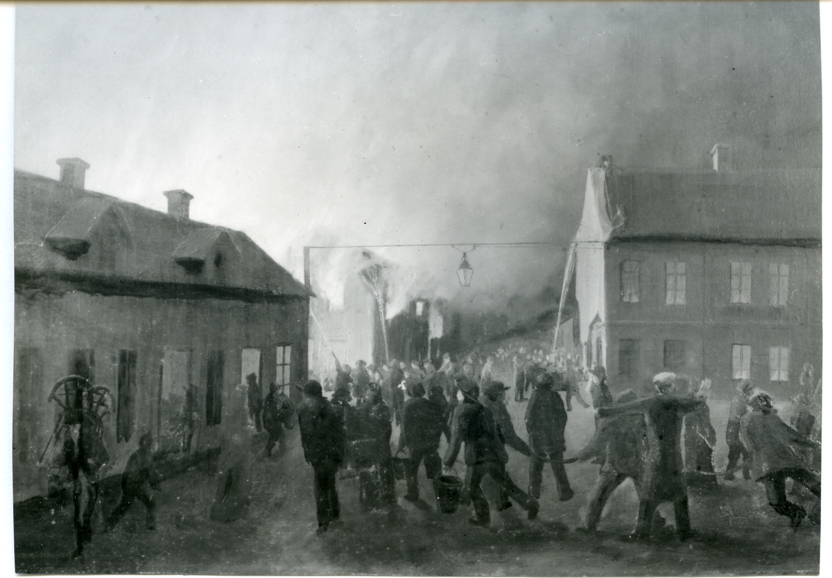 Målning föreställande branden i Sala 1880.