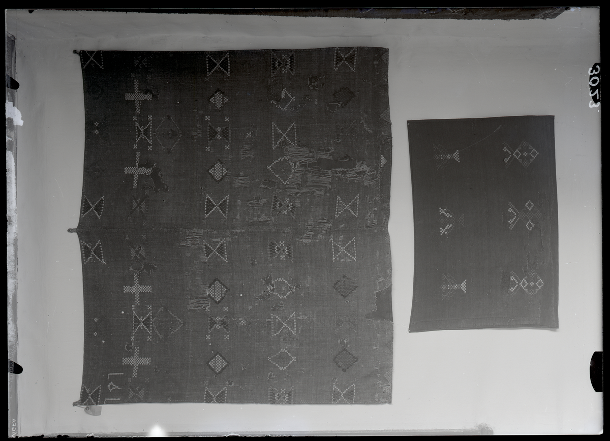 Vävnad, "halvkrabba", nu i Västmanlands fornminnesförenings samlingar. 2 st, Hedåker och Salbohed, Västerfärnebo, Västmanland.