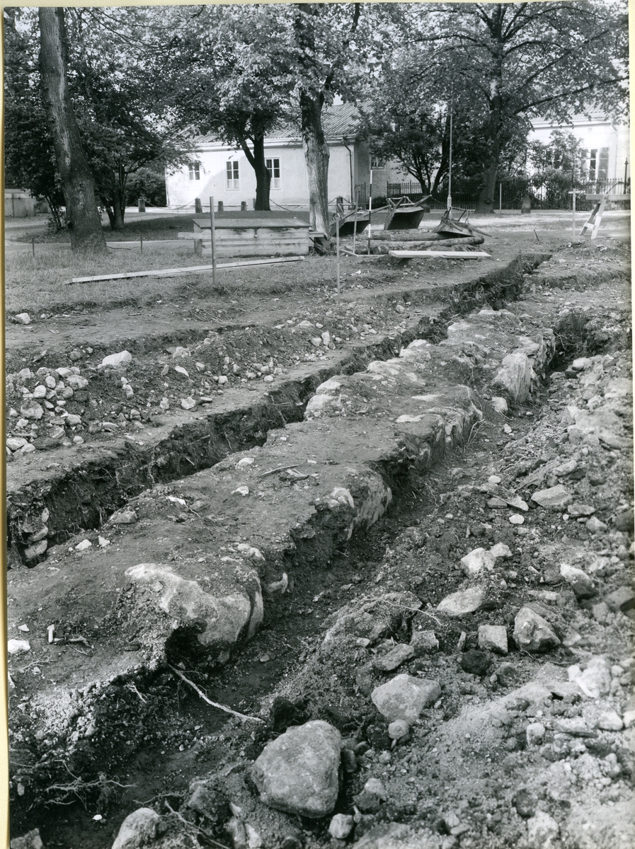 Titel: Västerås, kv. Proban. Den medeltida kyrkogårdsmuren utefter Biskopsgatan.
