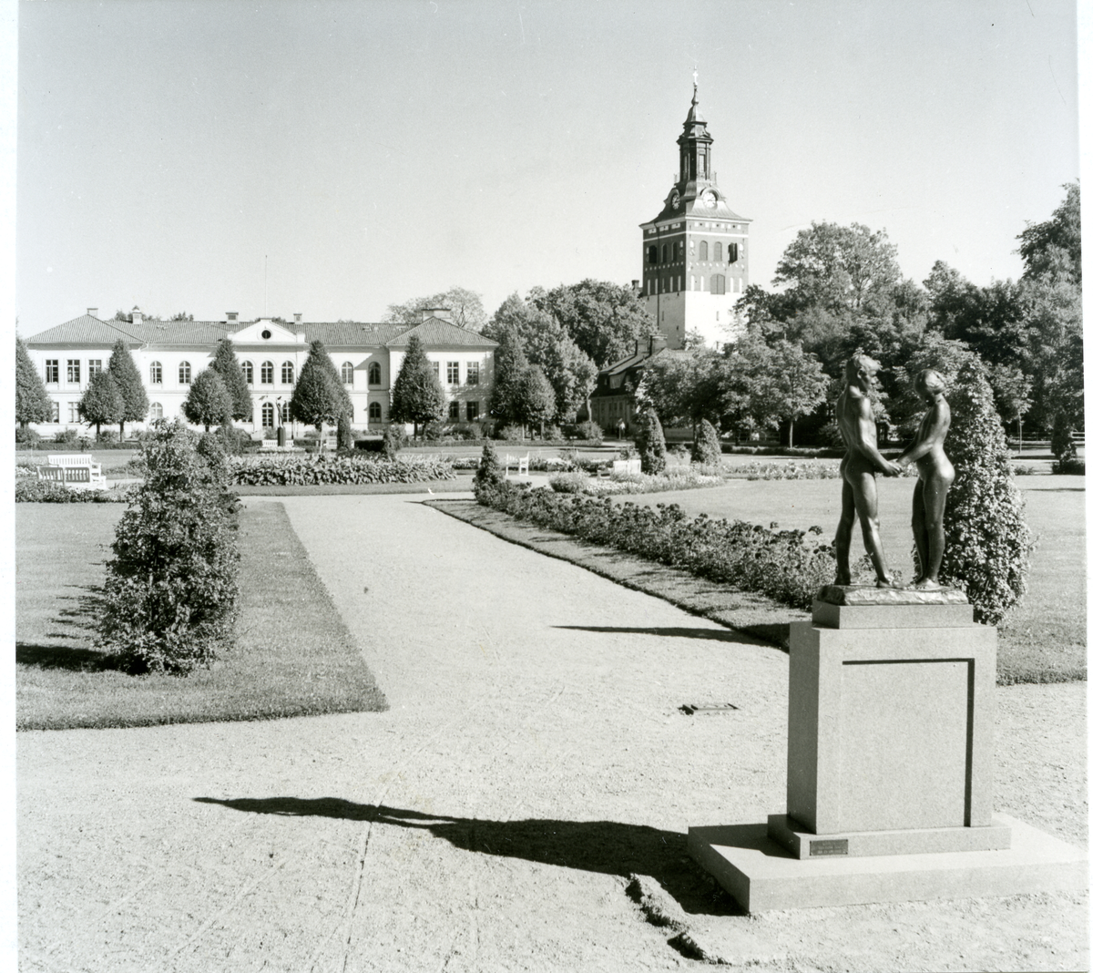 Stadsparken med staty och läroverk.