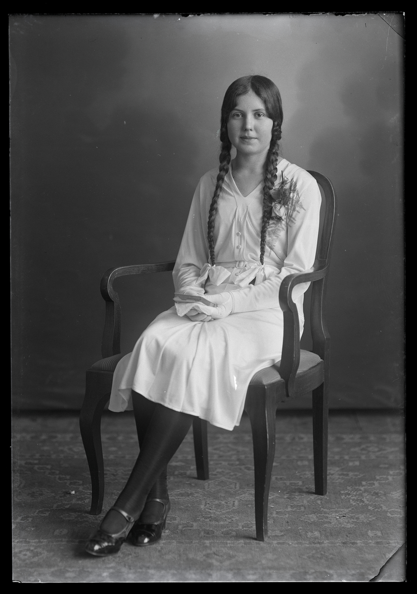 Porträtt, läsfoto. Edtit Jansson, Vänsta, Kolbäck.