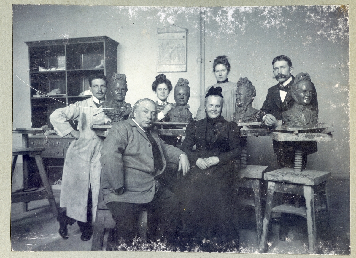 Två kvinnor och två män skulpterar av äldre kvinna med liten hatt. 1901.