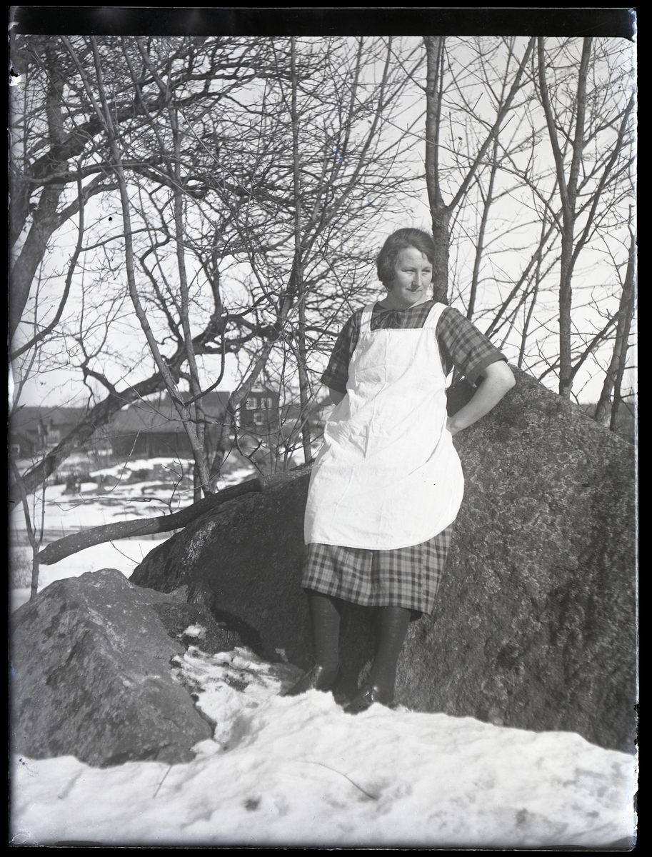 Porträtt av kvinna iförd förkläde, lutande sig mot en sten.