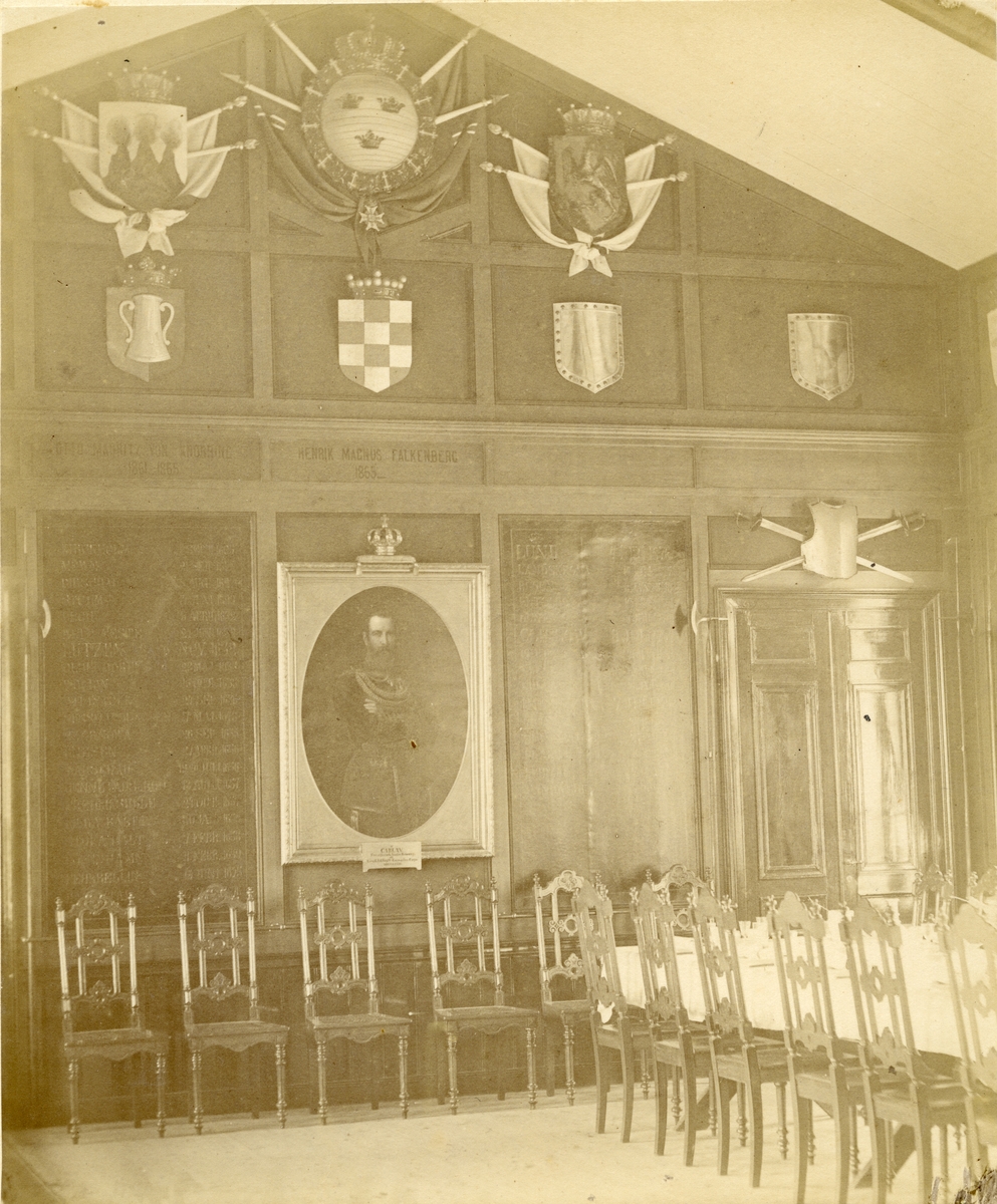Kungatavlor, vapensköldar, värjor, salsbord, stolar.