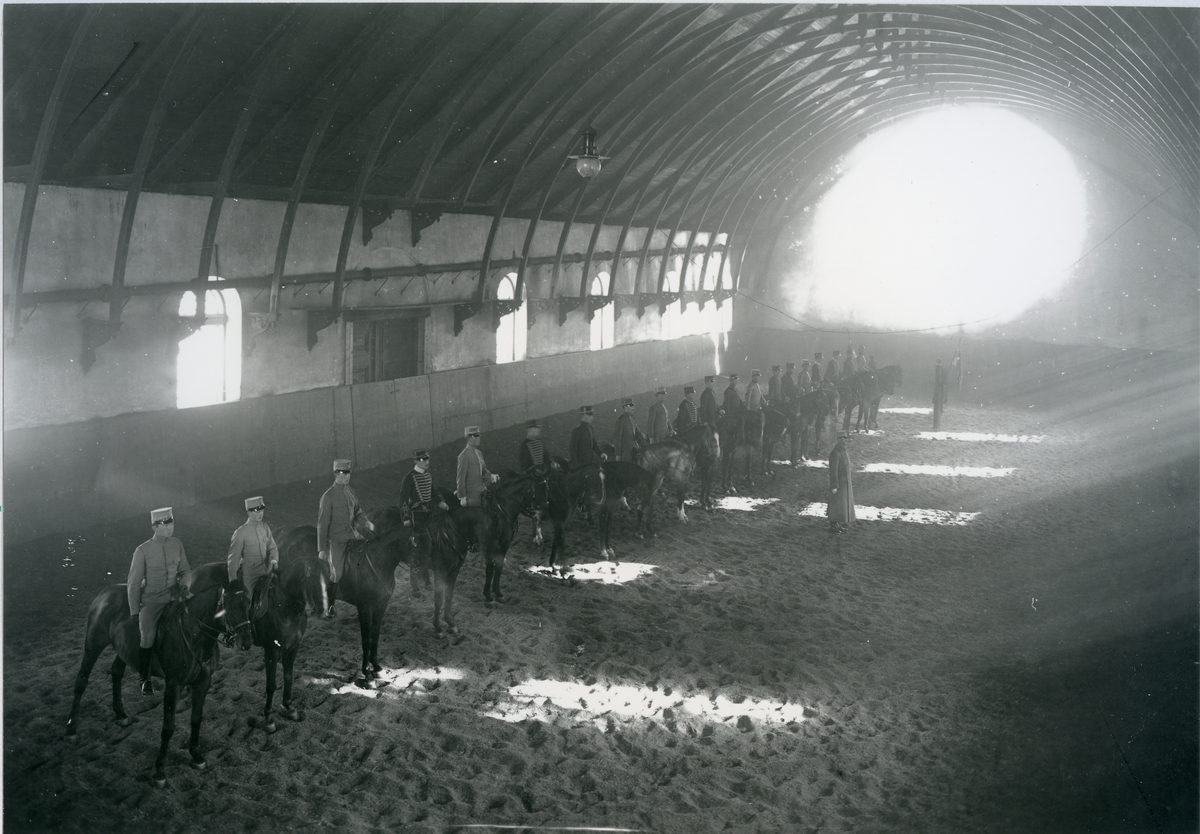 Ridskolan i Strömsholm. Interiör från ridhuset med hästar och ryttare.