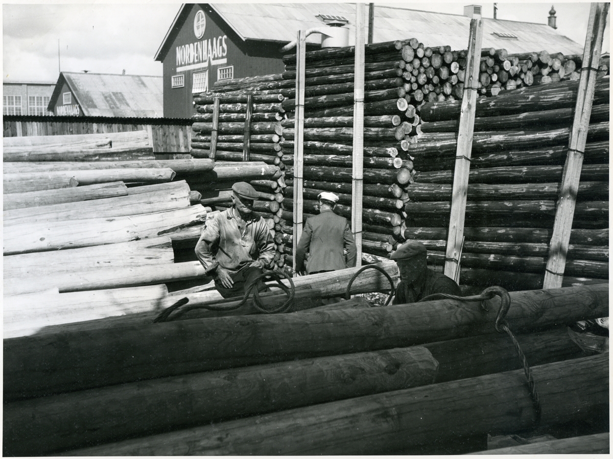 Kalle Kindell och Kalle Johansson lastar stolpar, 1950.