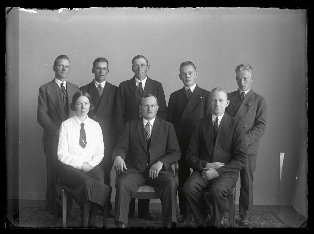 Grupporträtt, åtta personer. Chaufför Carl Pettersson, Sörkvarn, Hallstahammar.