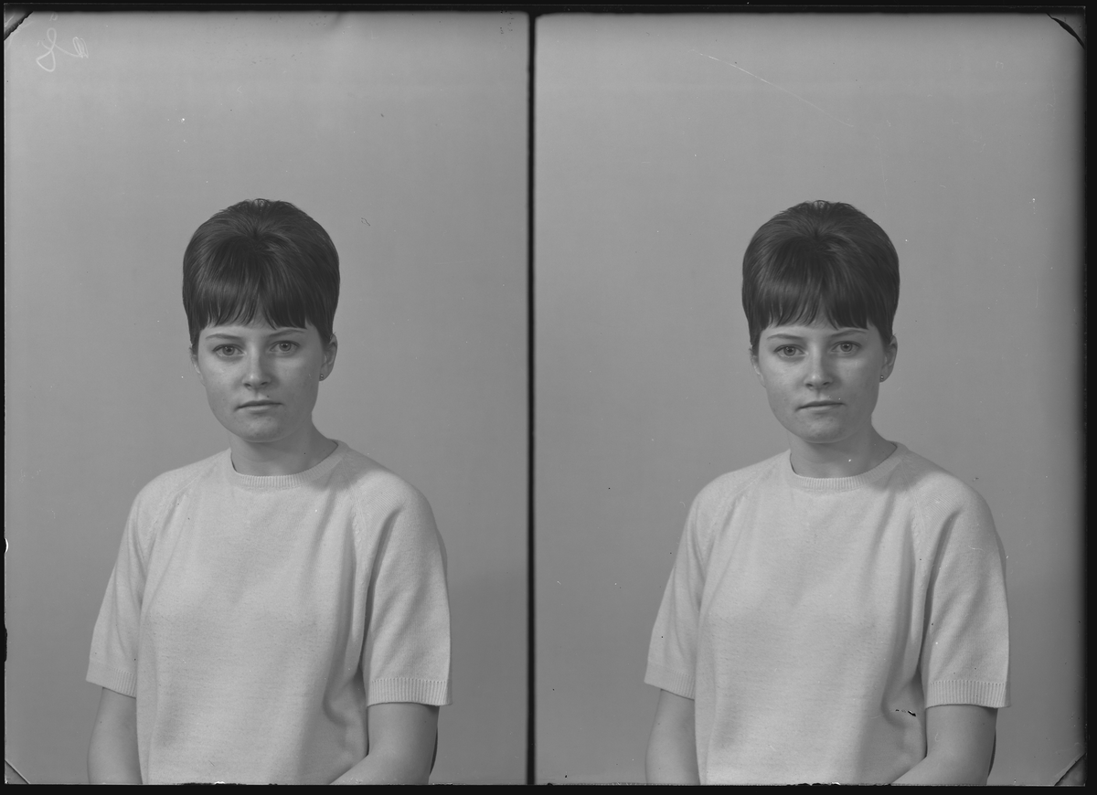 Kvinnoporträtt, pass. Eva Johansson, Östra Åvägen 45, Kolbäck. Ur Gustaf Åhmans samling.