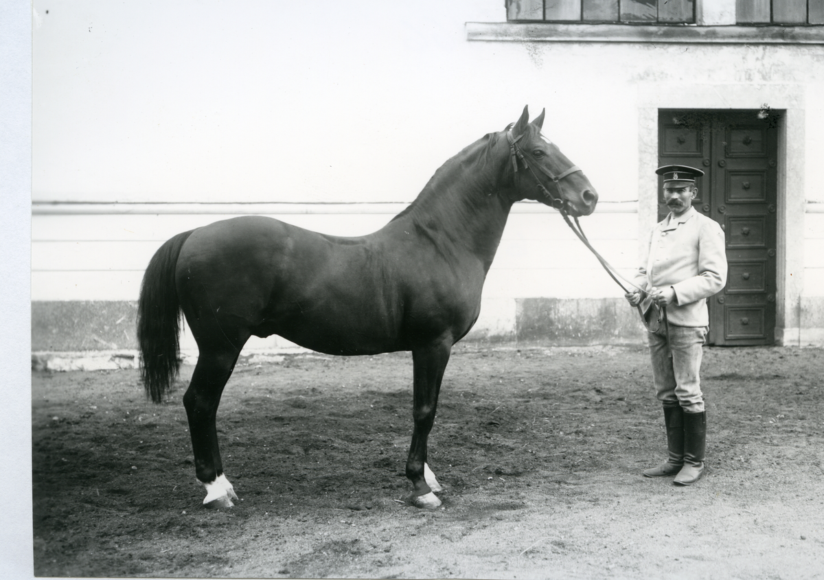 Man håller häst för fotografering, vid Strömsholms ridskola.