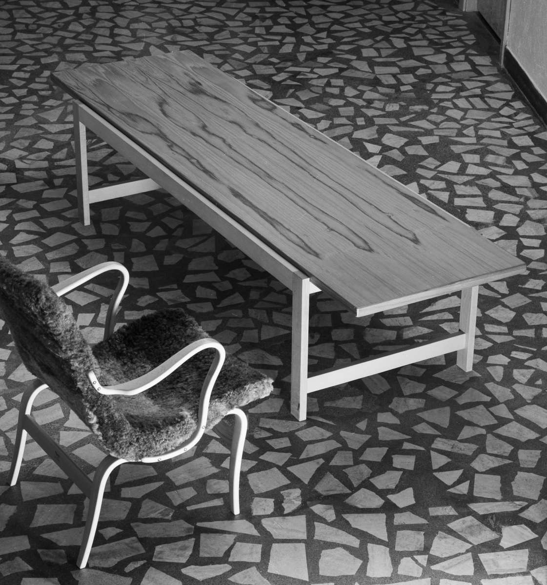 Interiör, fåtölj och bänk på mönsterlagt stengolv.