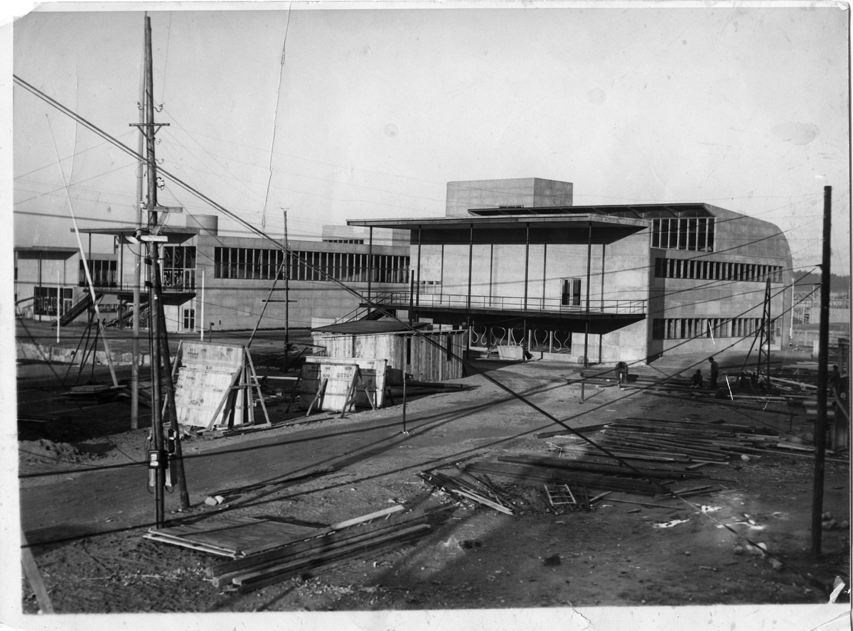 Hallarna för hemslöjd och bokkonst och grafisk industri med Dagens Nyheters terass under uppförande