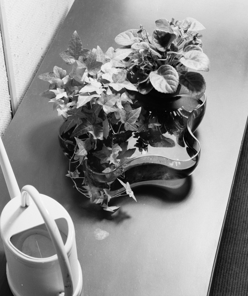 Titel: H55 Helsingborgsutställningen Interiör. Blomsterarrangemang på smalt bord och vattenkanna.
