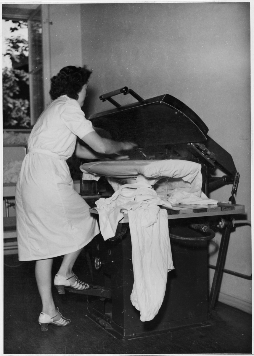 Interiör med kvinna som pressar tvätt