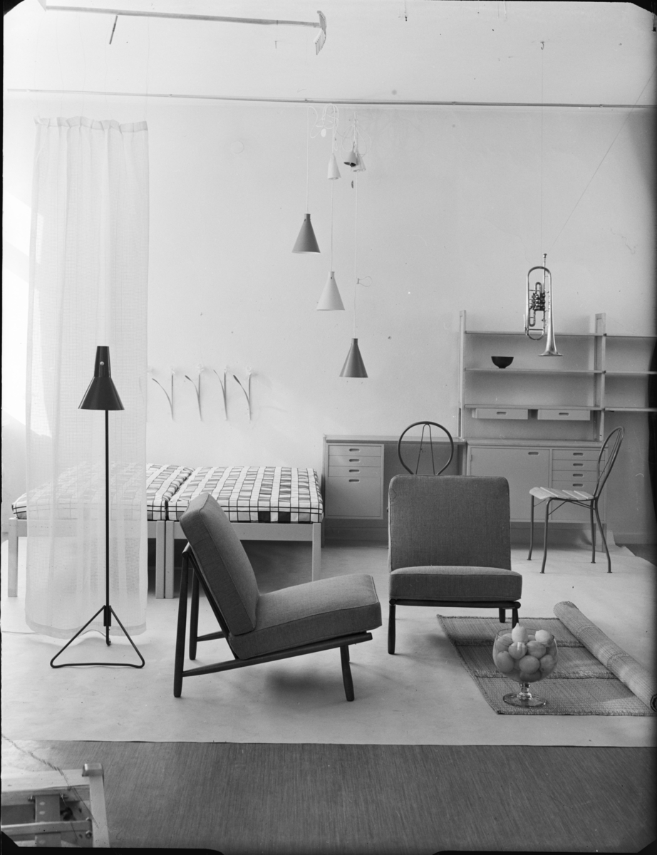 MÖBELUTSTÄLLNING I ATELJÉ, STOL HÄNGANDE, TRUMPET