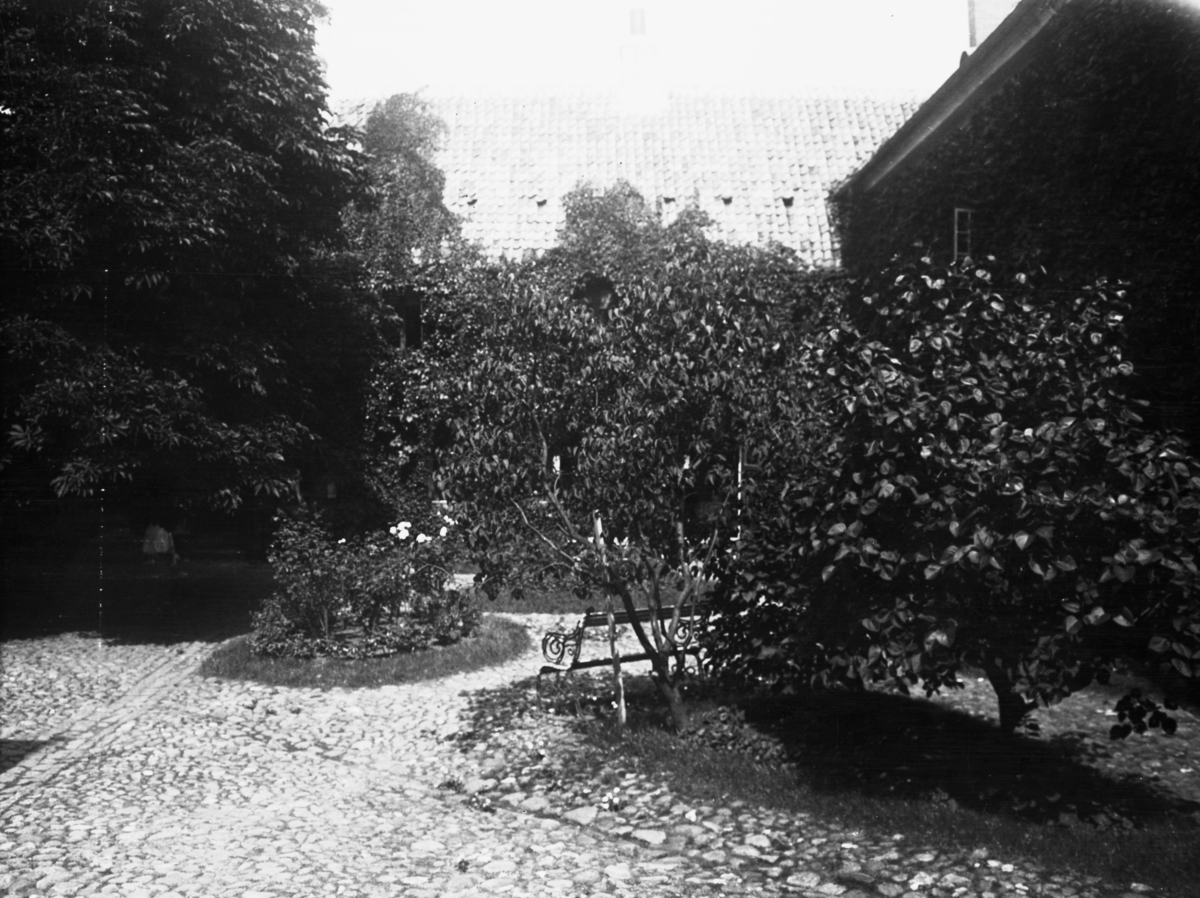 Titel: Okänd. Motiv svensk arkitektur. Trädgård med buskar.