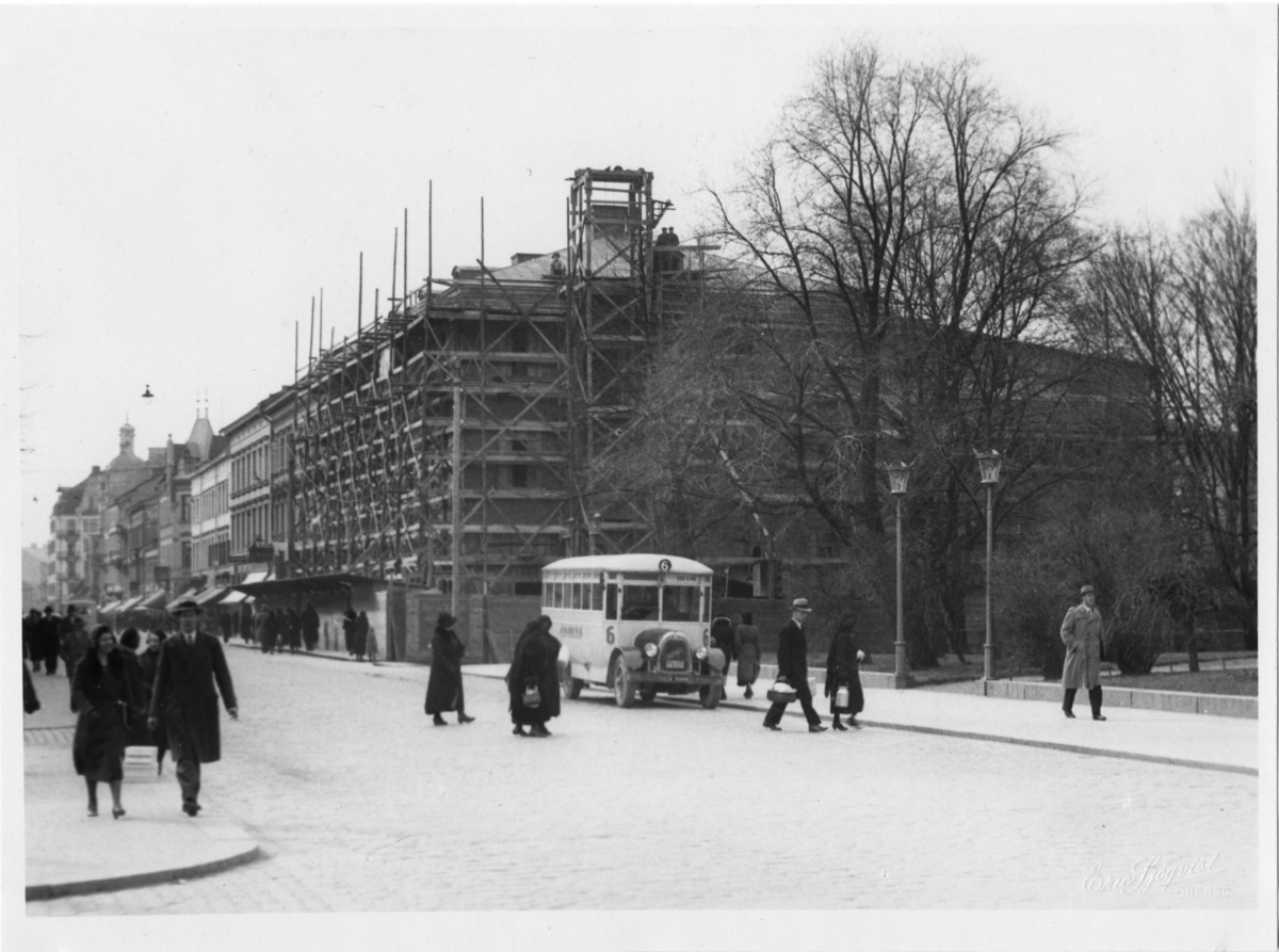 Exteriör dagtid under byggprocessen. Byggställningar i trä utmed fasad. I förgrunden en buss.