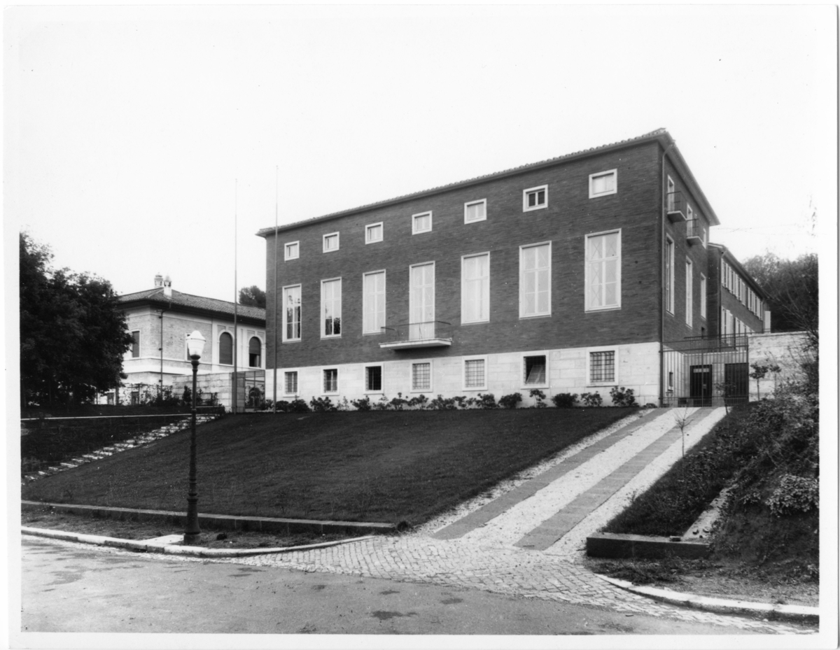 Titel: Svenska Institutet i Rom Exteriör med gräsmatta i förgrunden.