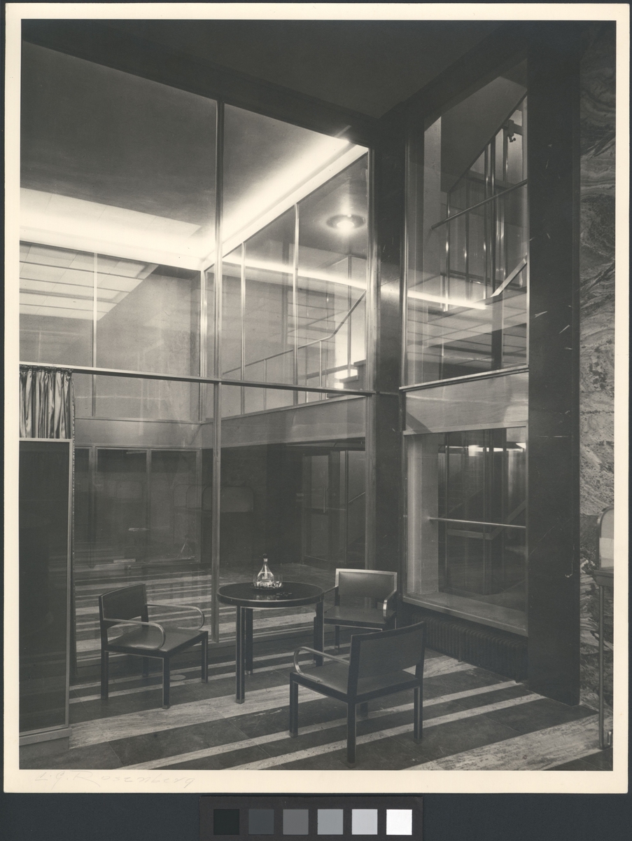 Titel: Citypalatset - Sydbankshuset Interiör. Bord och tre stolar.