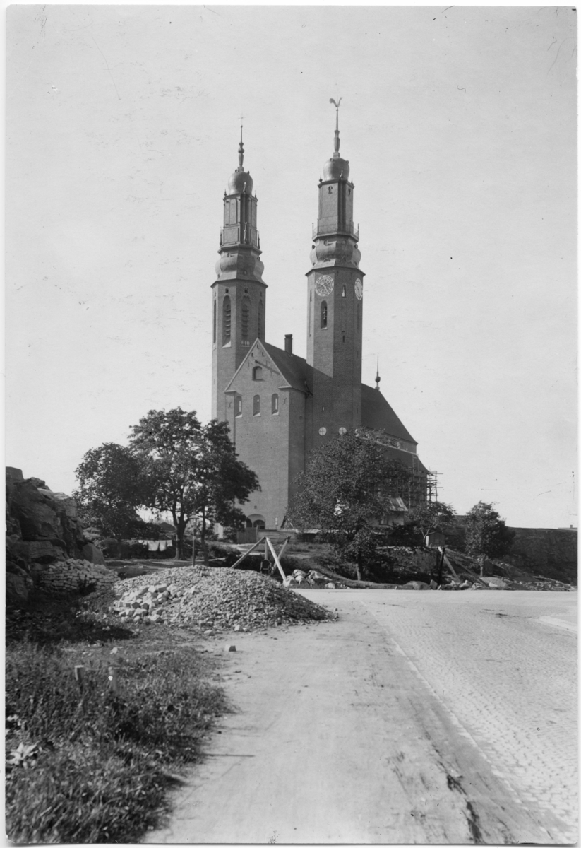 Titel: Högalidskyrkan Exteriör under byggprocessen. Byggställningar utmed sidoskepp.