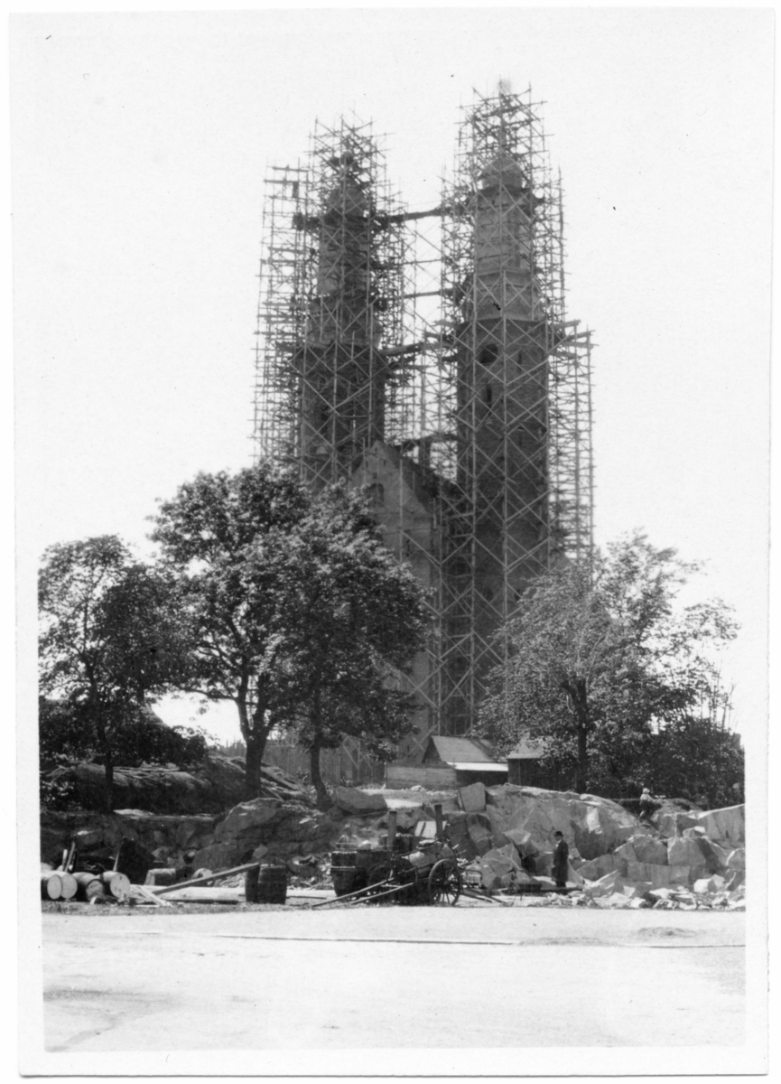 Titel: Högalidskyrkan Exteriör under byggprocessen. Byggställningar utmed tornen i öst.