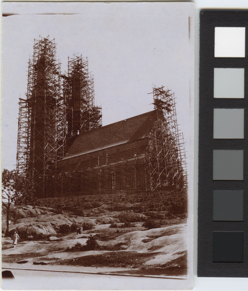 Titel: Högalidskyrkan Exteriör under byggnad. Byggställningar resta runt hela kyrkan.