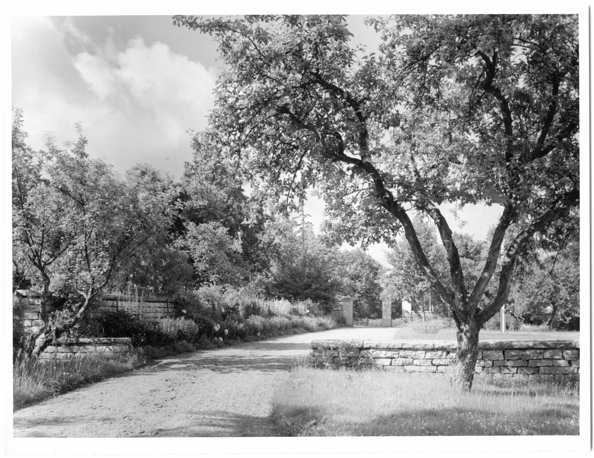 Trädgård med gräsmatta, stenmurar, buskar och träd.