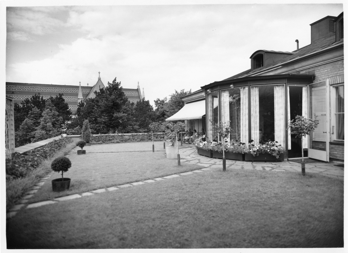 Exteriör dagtid. Takterrass med gräsmatta och planteringar i förgrunden.