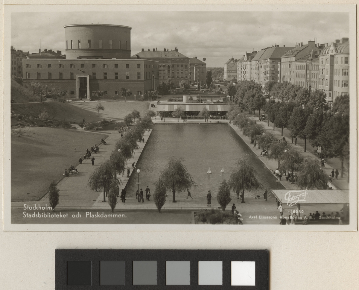 Vykort. Exteriör, stadsbiblioteket med Observatorieparken och plaskdammen.