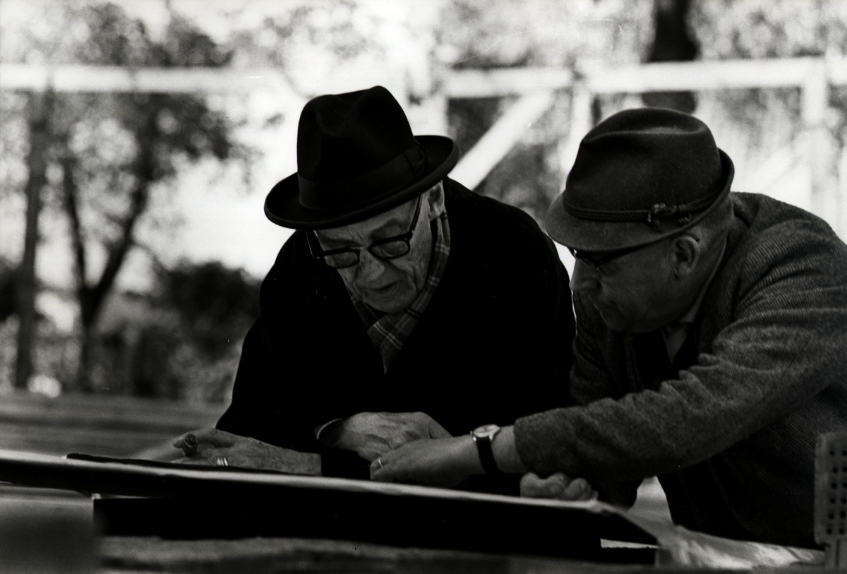 Porträttbild av Sigurd Lewerentz och verkmästare Sjöholm vid S:t Petri kyrka
