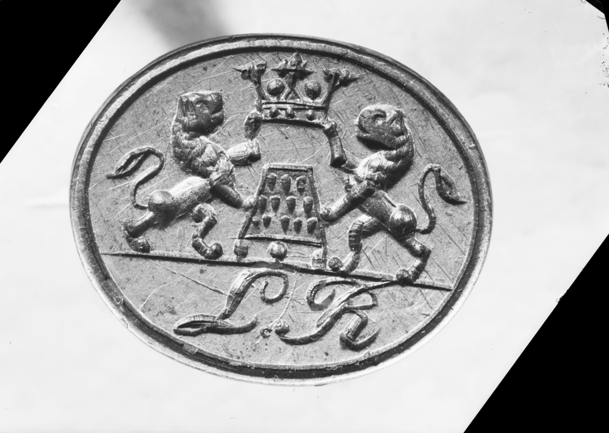 Skylt med två lejon som bär en krona, under dem 'L.R'