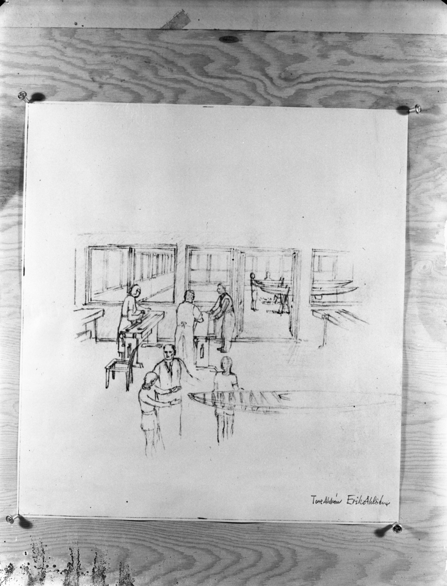 Teckning av Tore och Erik Ahlsén med en verkstad och åtta personer som snickrar och bygger båtar.