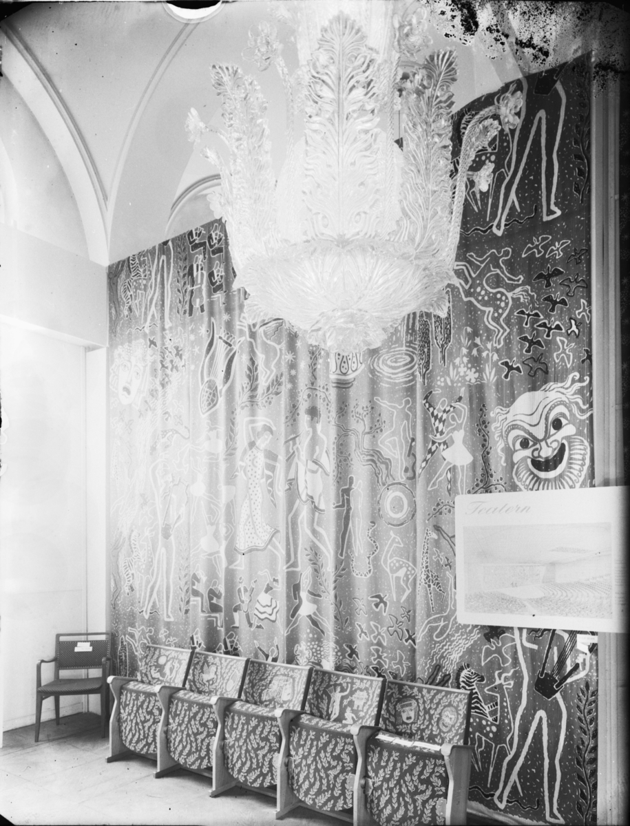 Draperi, ljuskrona och en rad med teater-eller biografstolar