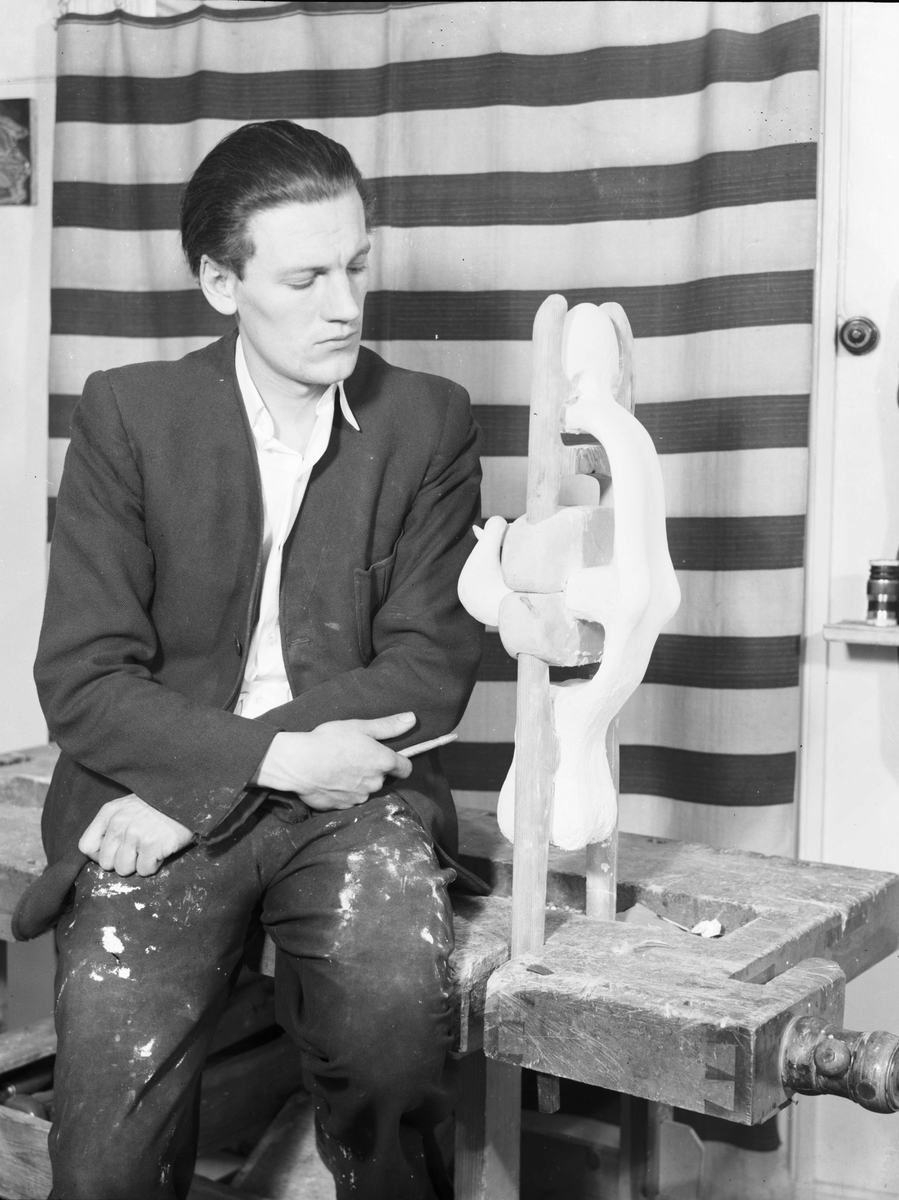 Porträtt av Egon Möller-Nielsen sittande på en snickarbänk med ett av sina verk.