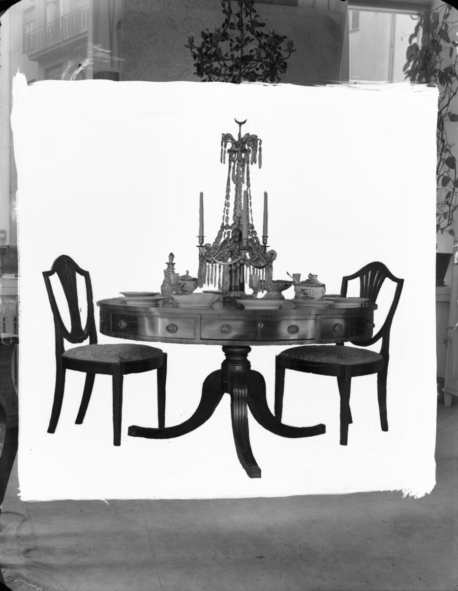 Uppdukat bord, stolar och en stor kandelaber med kristaller.