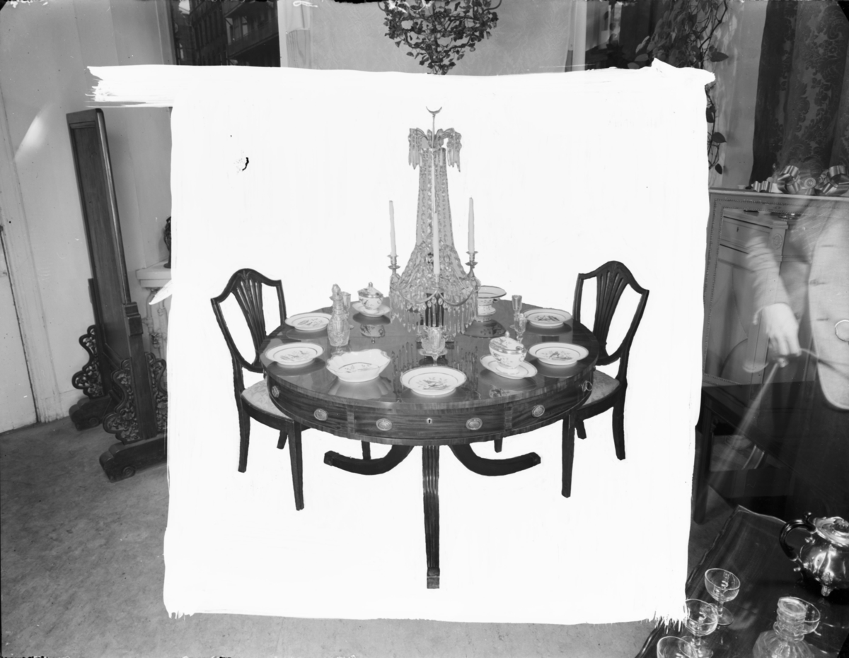 Uppdukat bord, stolar och en stor kandelaber med kristaller.
