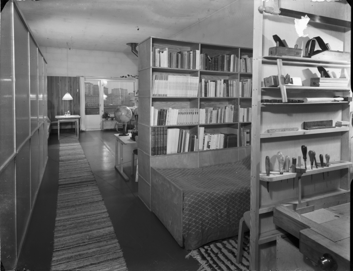 Stort rum uppdelat för snickarbänk, sovalkov och vardagsrum