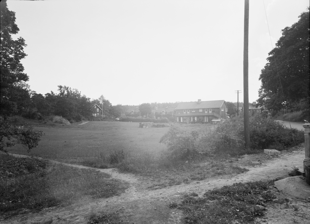 Titel: Bebyggelse och äng Exteriör