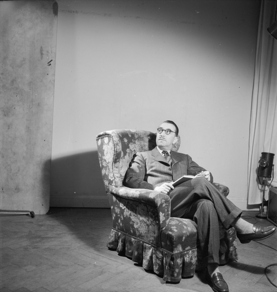 Man i kostym sittande i fåtölj
