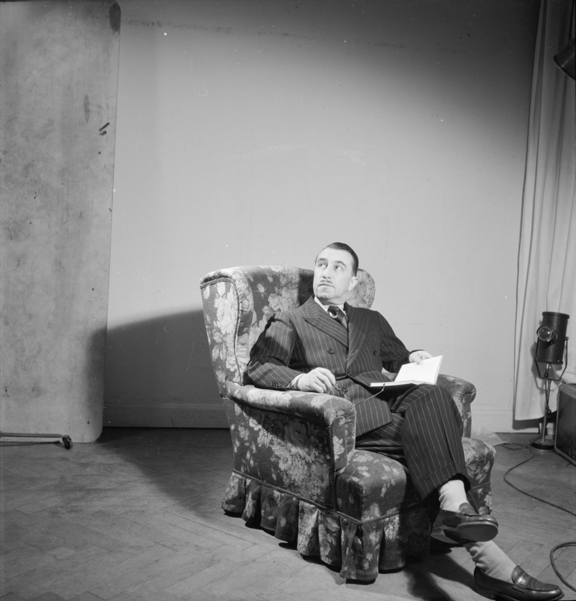 Man i kostym sittande i fåtölj