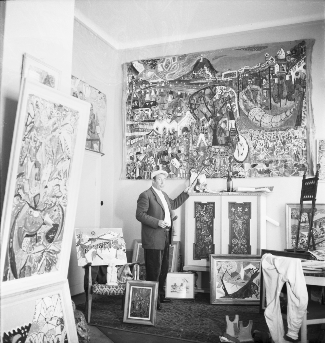 Titel: Portätt av konstnären Uno Vallman i sin ateljé Interiör