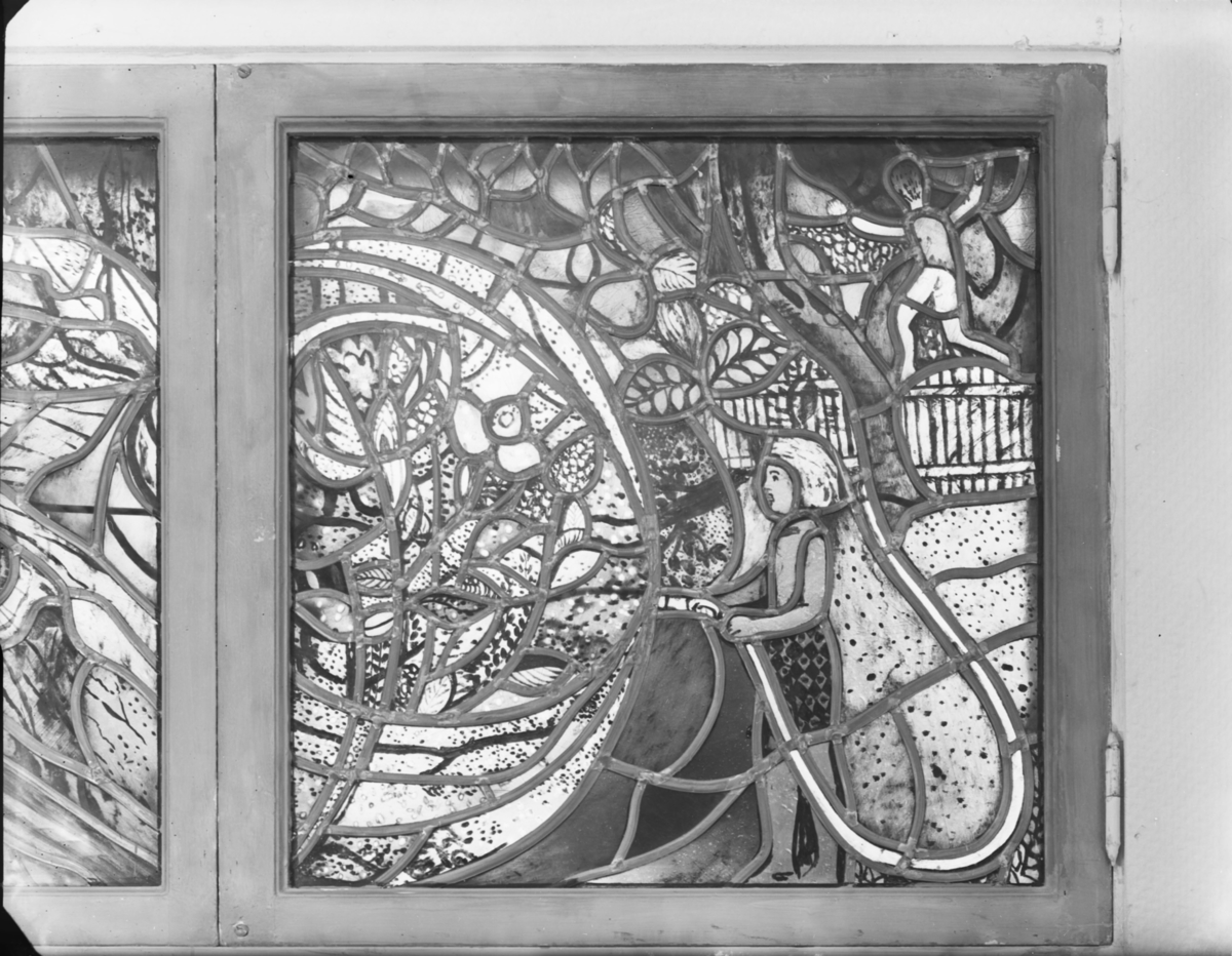 Fönster med blyinfattning föreställande kvinna med vattenslang och pojke som klättrar i träd av konstnären Sven Erixon
