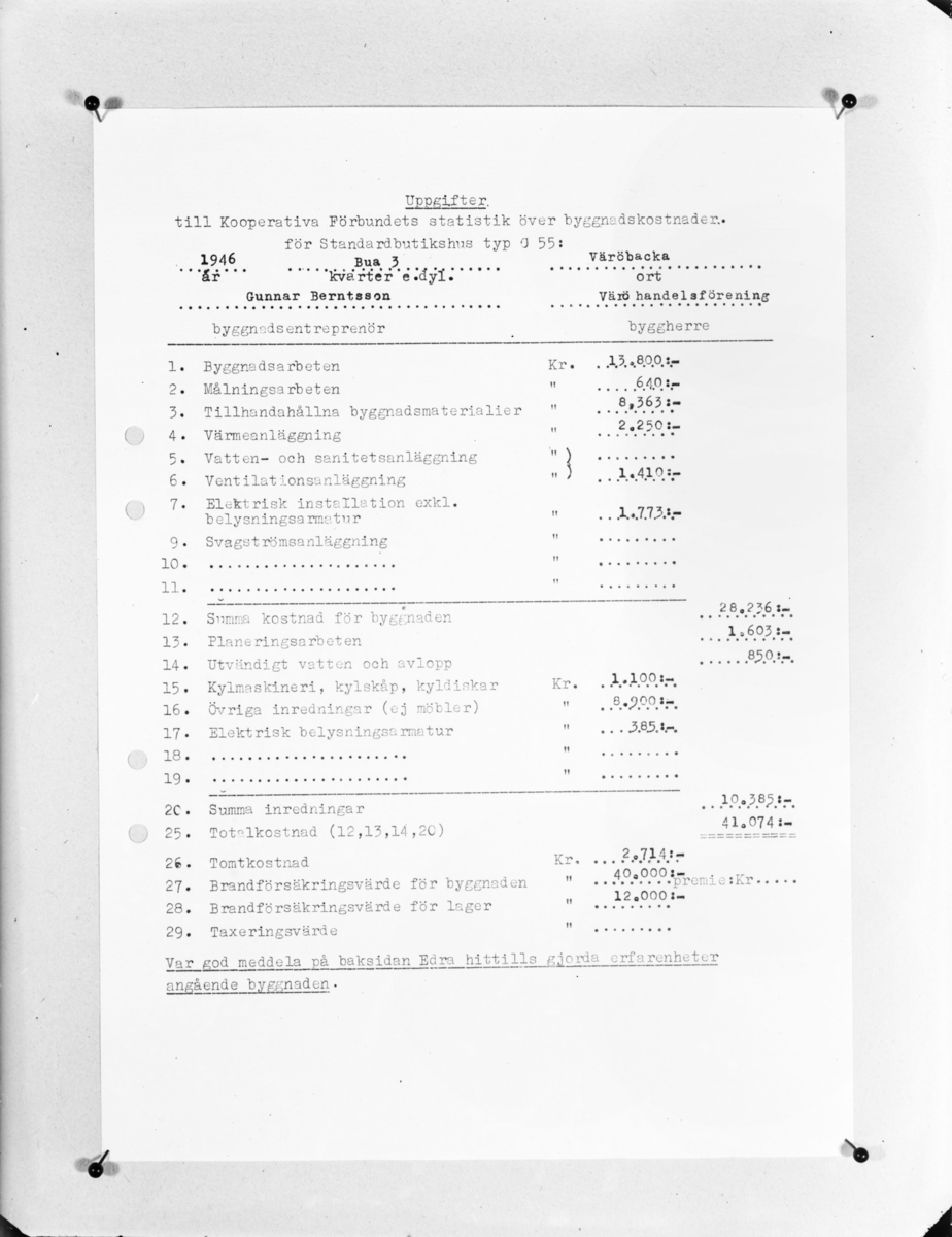Byggnadskostnader för Konsum i Väröbacka 1946