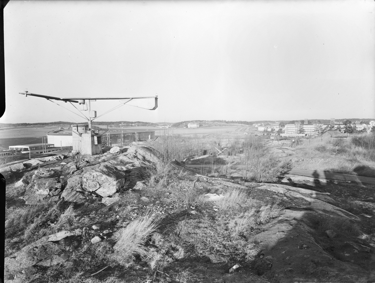 Titel: Vy över delvis bebyggt landskap I förgrunden utrustning från telegrafstyrelsen