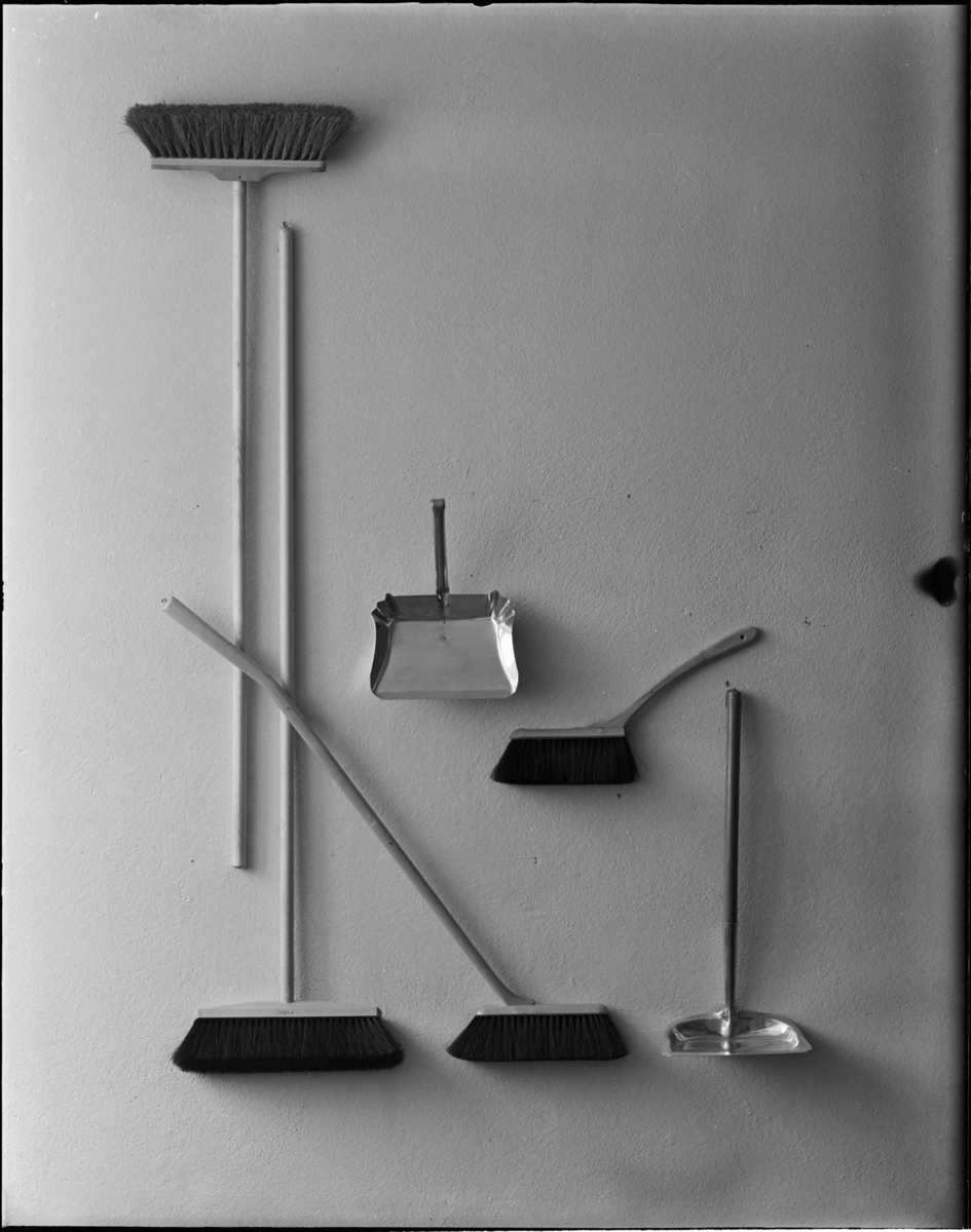 Titel: Borstar och skyfflar på vägg, dammsugare