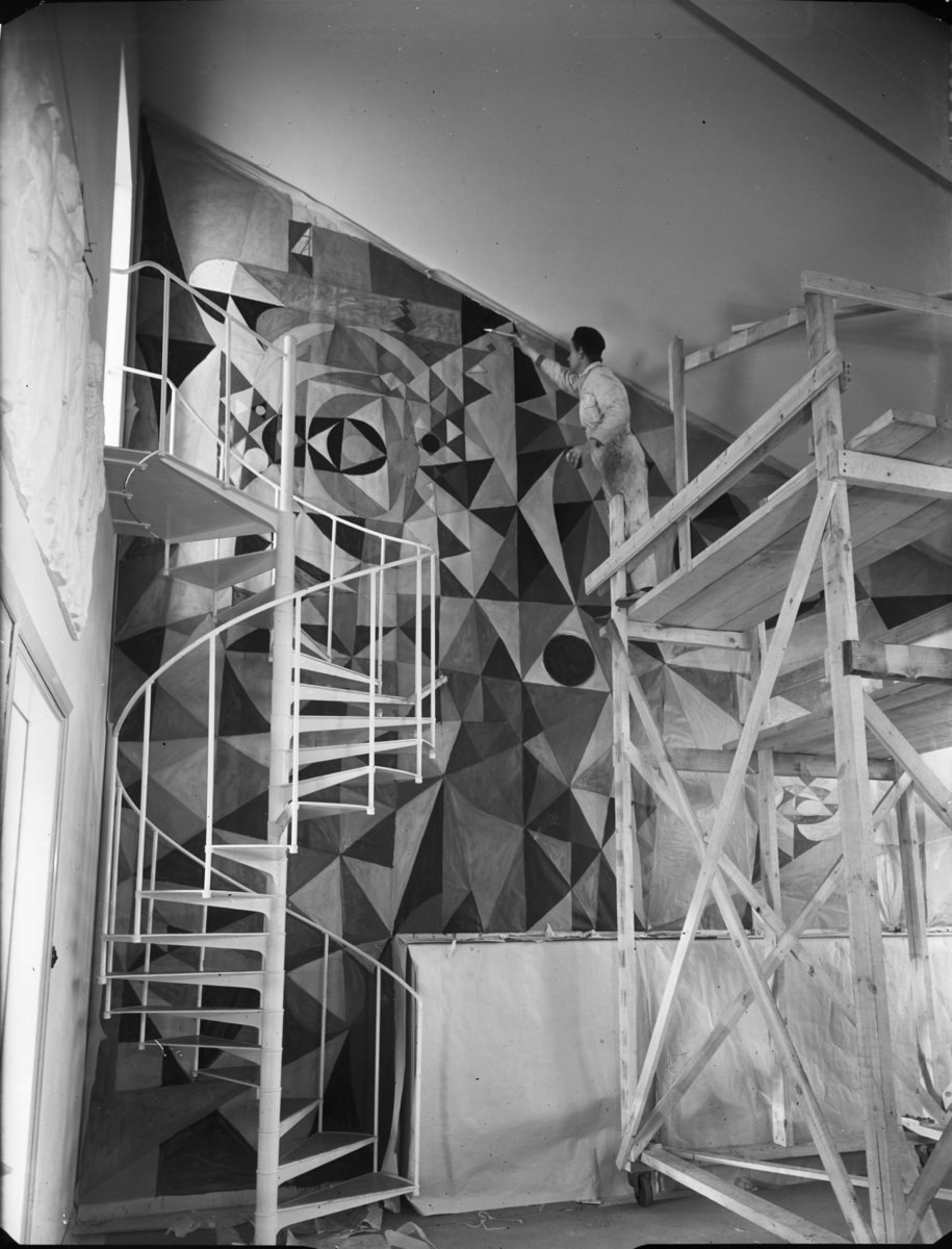 Konstnären Lennart Rodhe under arbete med väggmålning i Ängby läroverk