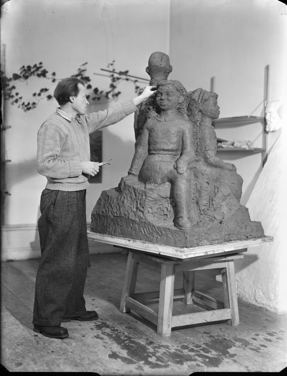Porträtt av skulptören i arbete med skulptur med tre barn