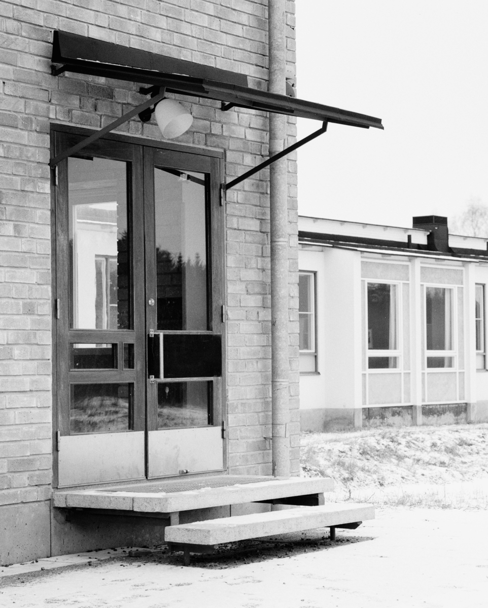 Exteriör, detalj av fasad med entrédörr under skärmtak