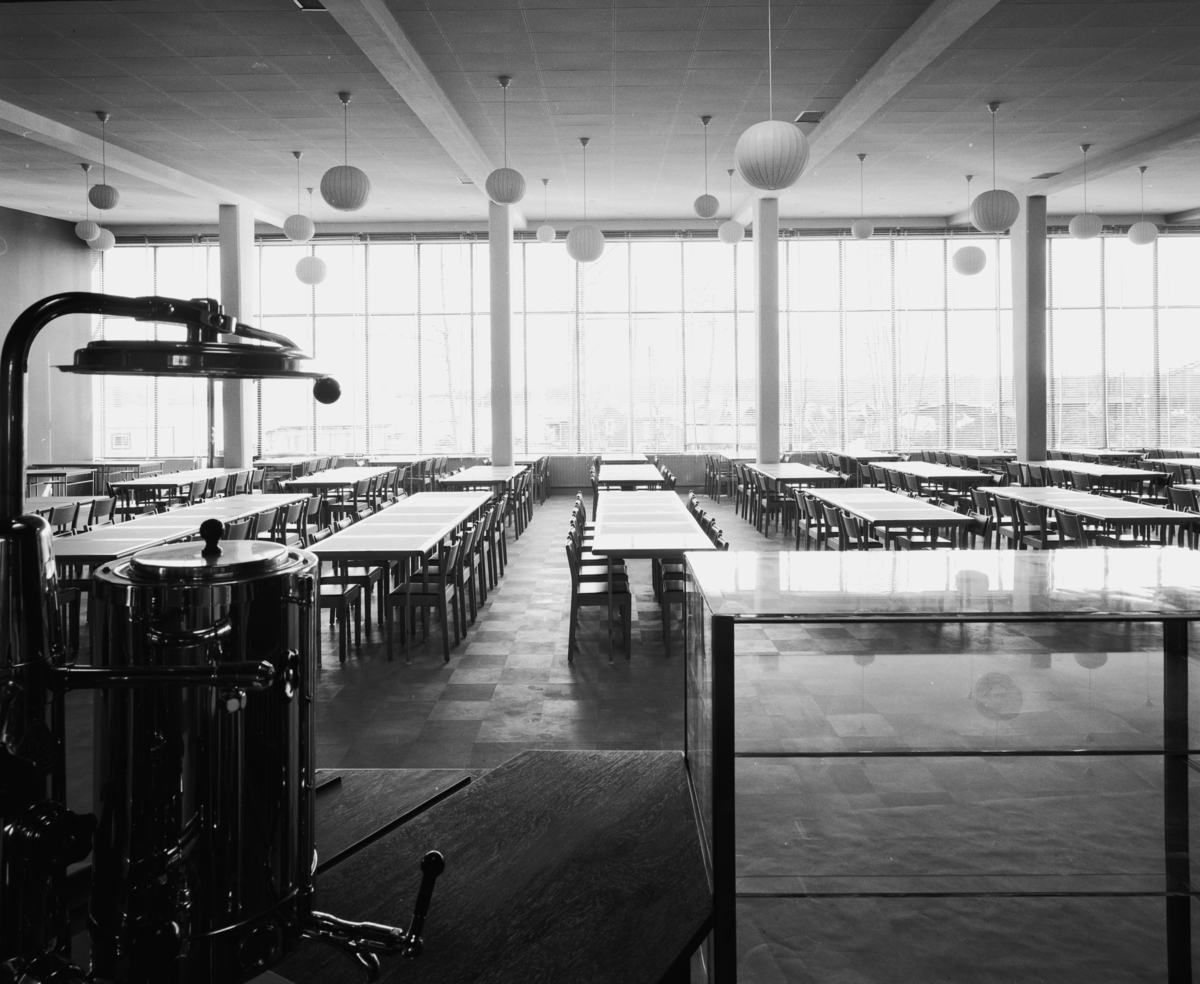 Interiör matsal, långa bordsrader längs uppglasad vägg