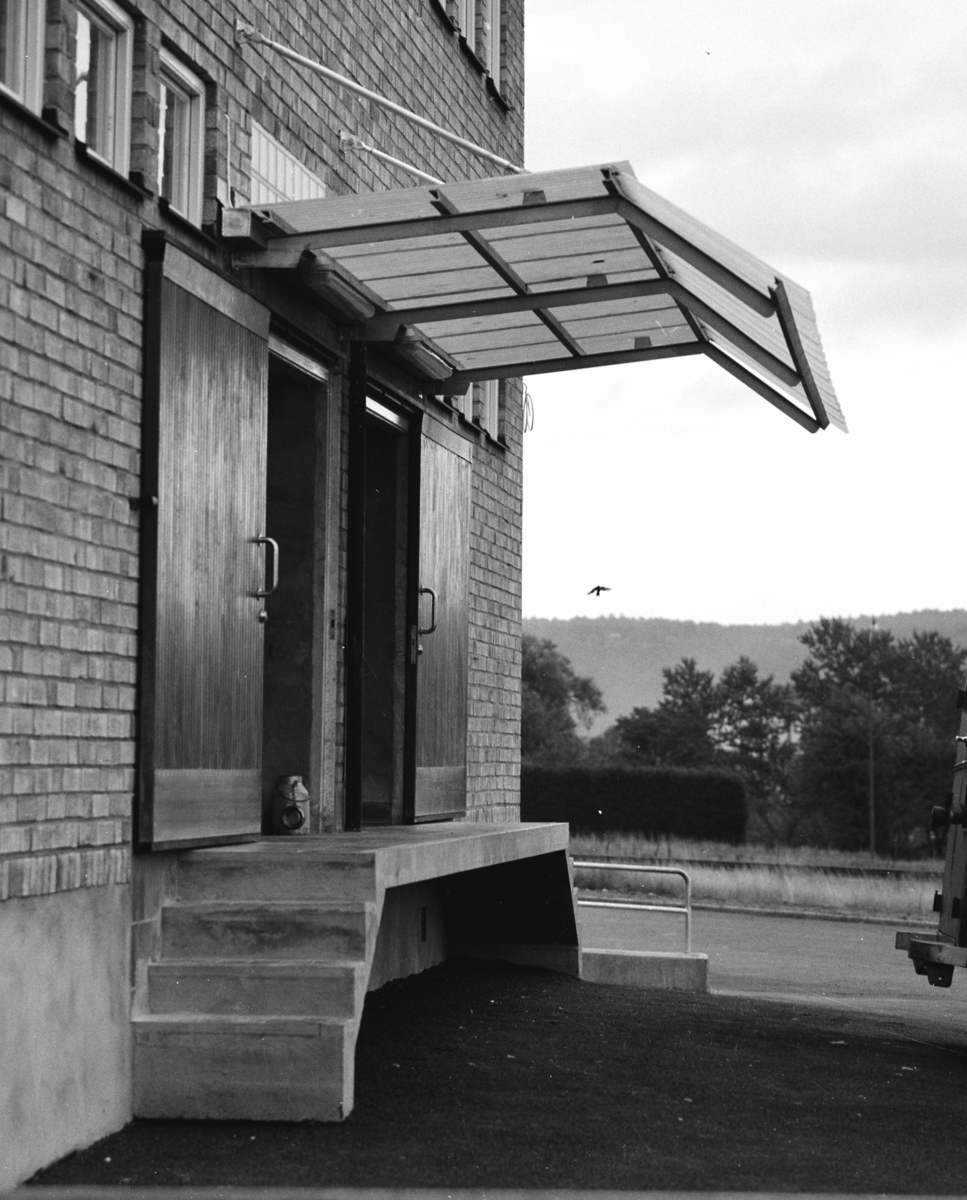 Exteriör, detalj av fasad med skärmtak ovanför lageringång.