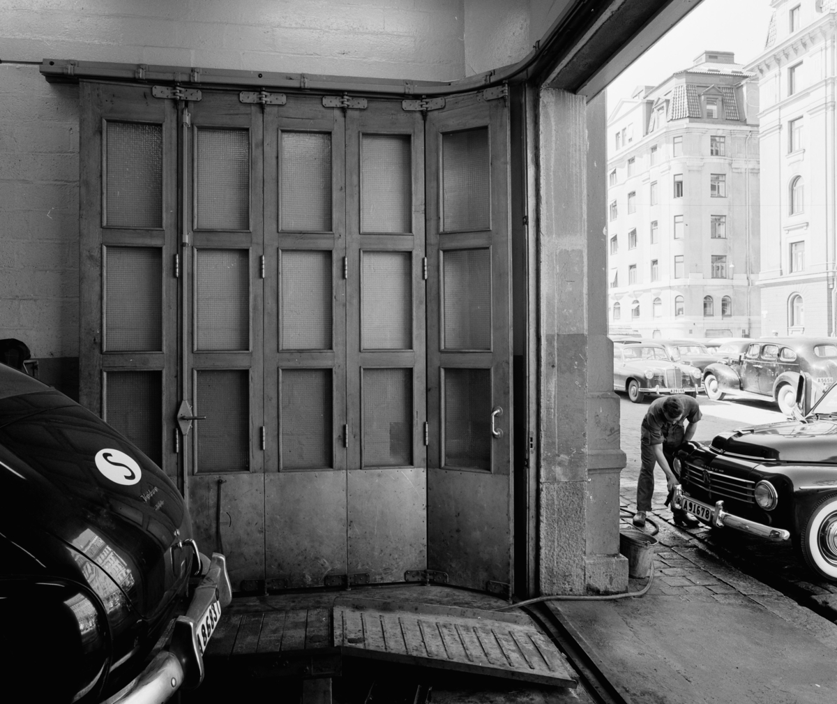 Interiör, öppen skjutdörr mot gatan, med bakdel av bil